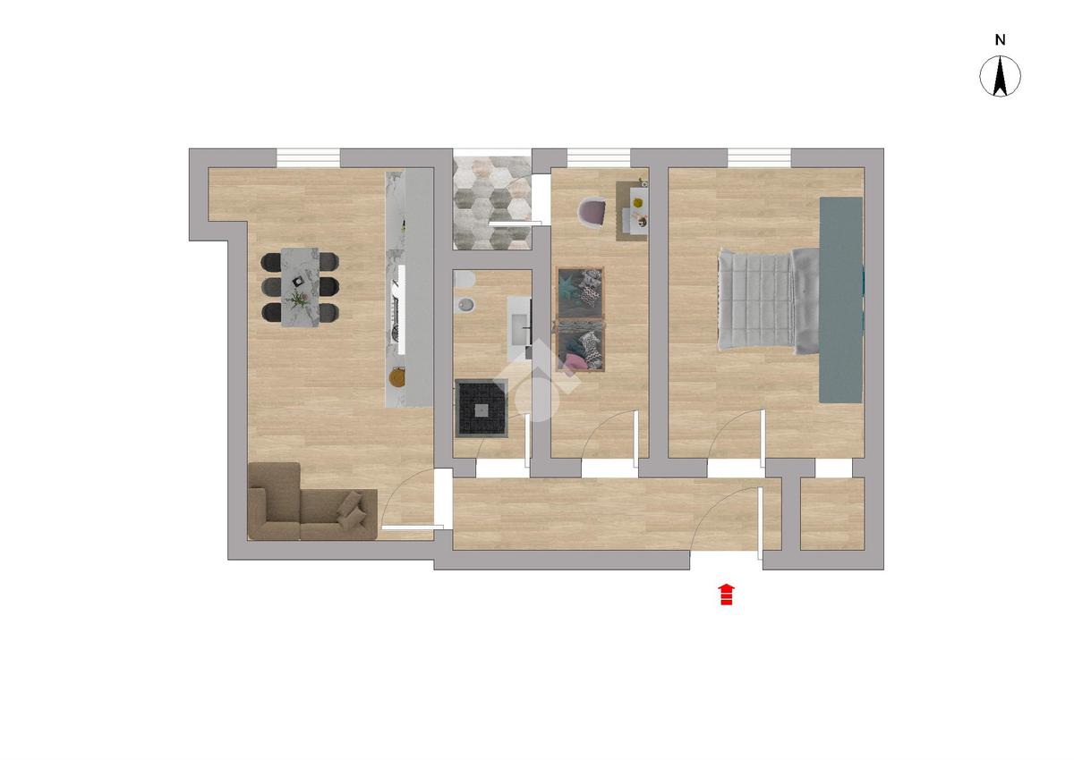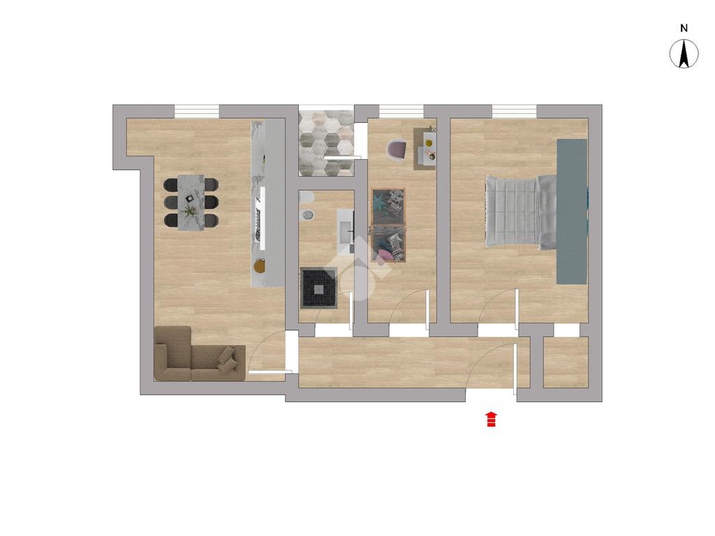 L’appartamento è composto da soggiorno con angolo cottura, bagno, cameretta, camera matrimoniale con cabina armadio e completa la proprietà un piccolo balcone a cui si accede tramite la cameretta.
